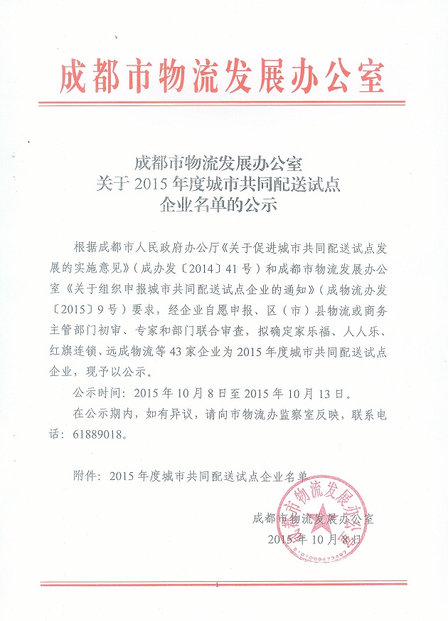 成都市物流發(fā)展辦公室公示2015年度城市共同配送試點(diǎn)企業(yè)名單,四川物通科技集團(tuán)有限公司成為現(xiàn)代物流技術(shù)應(yīng)用類試點(diǎn)企業(yè)。