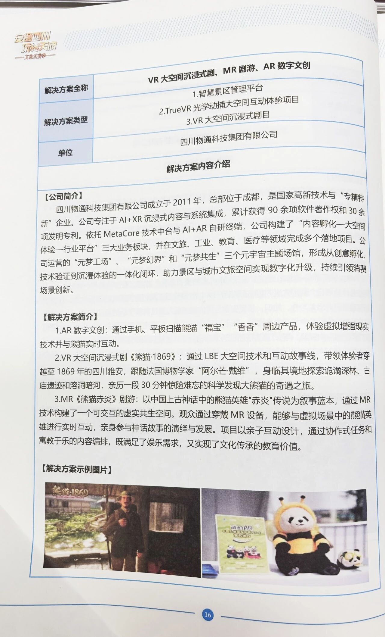 7月11日,四川物通科技集團(tuán)有限公司受邀參加“2025中國(成都)動(dòng)漫游戲消費(fèi)季——首屆天府星游會(huì)·文旅消費(fèi)場(chǎng)景創(chuàng)新升級(jí)精準(zhǔn)對(duì)接會(huì)”,并憑借“VR大空間沉浸式劇目、MR沉浸式劇游、AR數(shù)字文創(chuàng)”等系列解決方案,成功入選會(huì)上發(fā)布的《文旅消費(fèi)場(chǎng)景項(xiàng)目及需求手冊(cè)》。