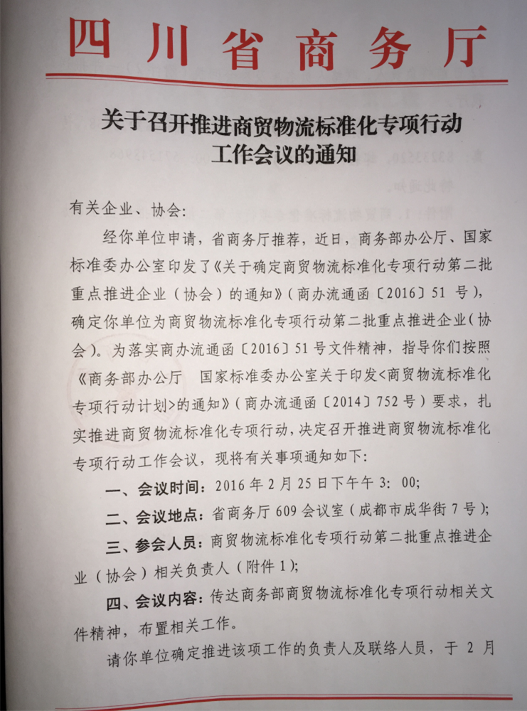 近日,四川省商務(wù)廳召開關(guān)于推進(jìn)商貿(mào)物流標(biāo)準(zhǔn)化專項(xiàng)行動的工作會議,四川物通科技集團(tuán)有限公司作為商貿(mào)物流標(biāo)準(zhǔn)化專項(xiàng)行動第二批重點(diǎn)推進(jìn)企業(yè)應(yīng)邀參加。